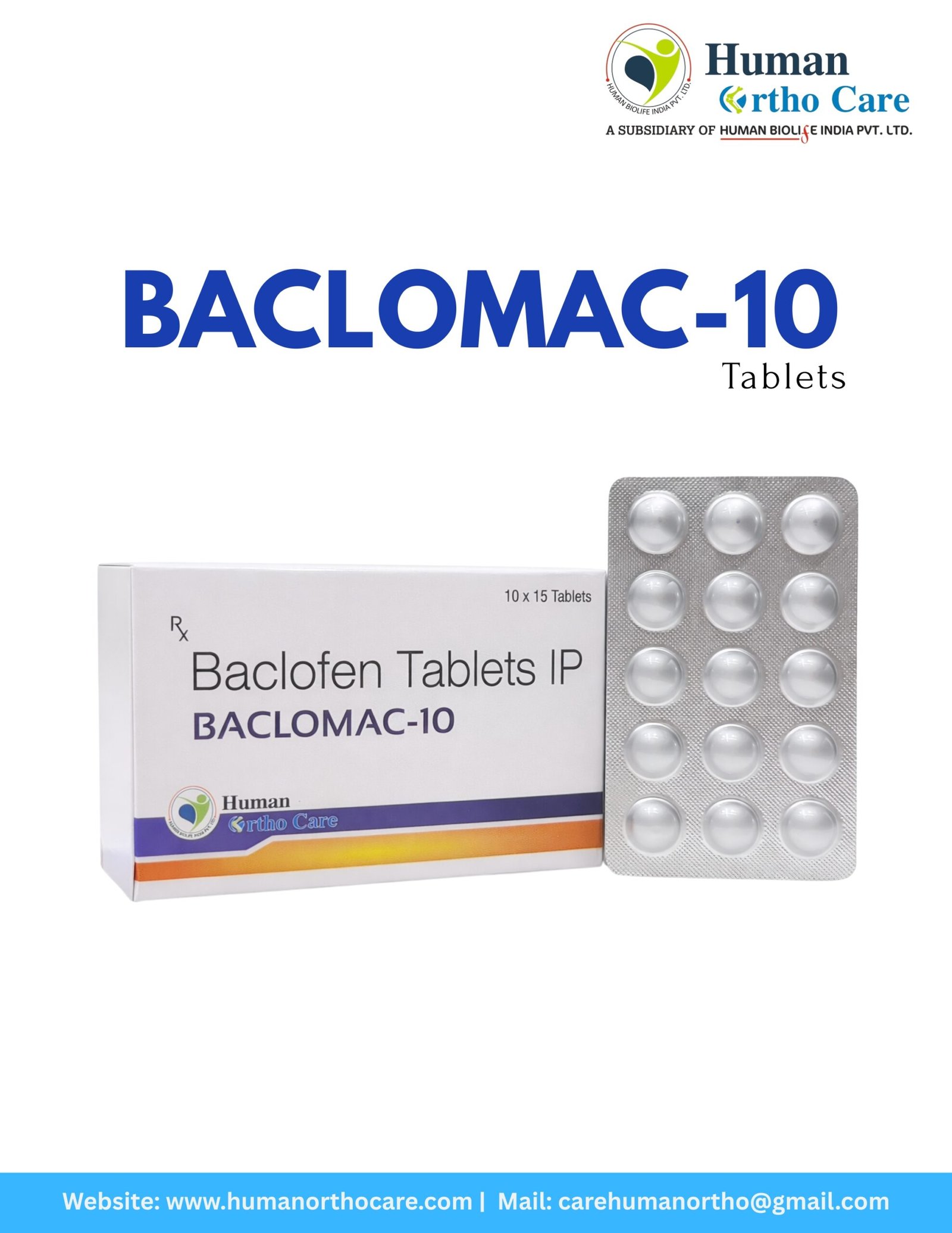 BACLOMAC-10 is a highly effective muscle relaxant primarily used to treat muscle spasms and stiffness. Distributed by Human Ortho Care, these tablets are specifically formulated for patients suffering from conditions like multiple sclerosis, spinal cord injuries, or cerebral palsy. The active ingredient, Baclofen, works as an antispastic agent that affects the transmission of reflexes at the spinal cord level.