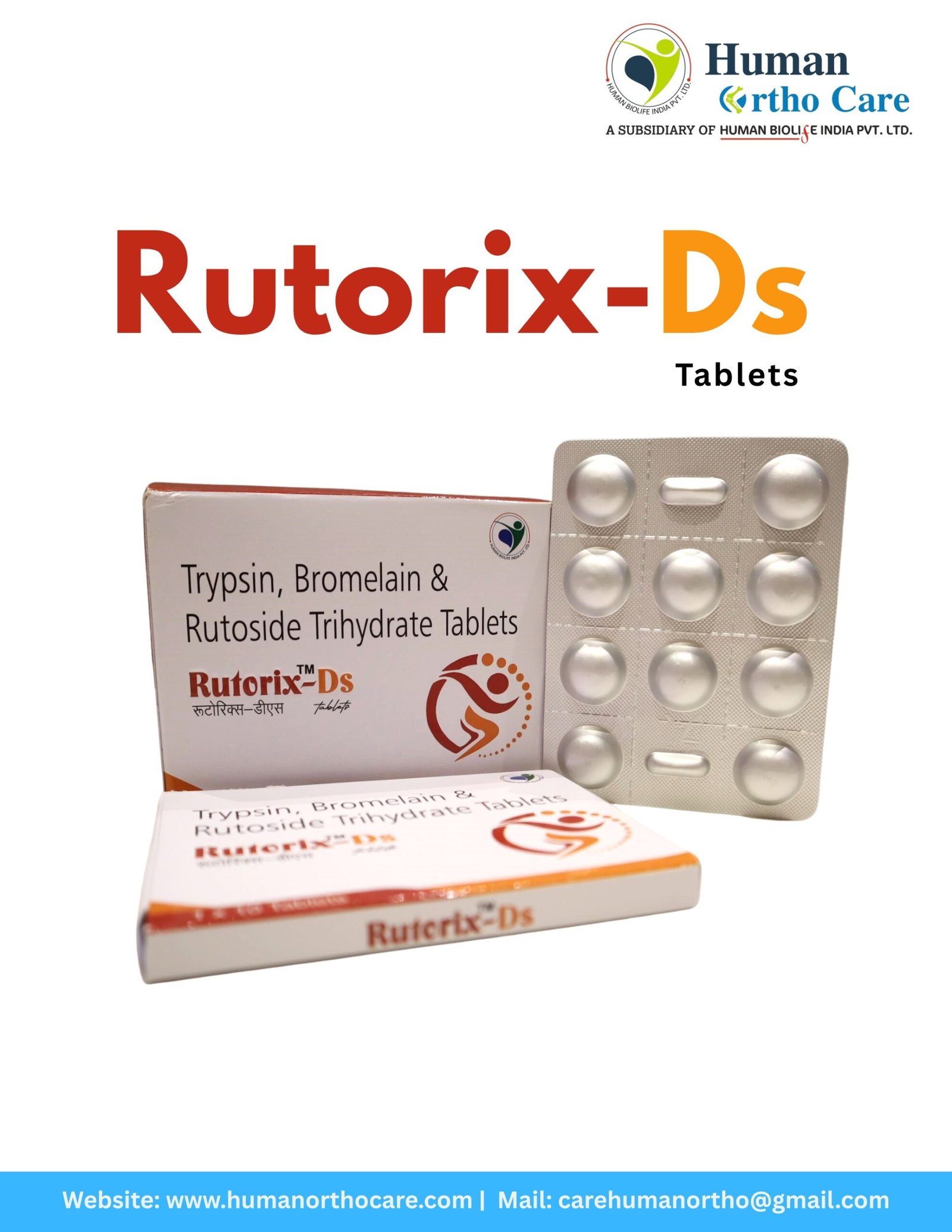 Rutorix-Ds is an advanced enzyme-based therapy designed to promote faster recovery from inflammation and edema (swelling). Marketed by Human Ortho Care, these tablets are widely used to treat post-operative wounds, sports injuries, and inflammatory conditions like rheumatoid arthritis or spondylosis.